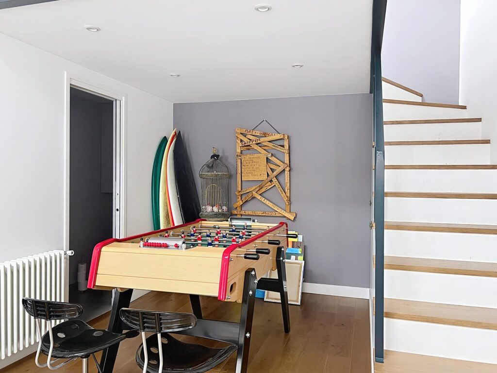 Le terrain est clôturé et très agréable avec une terrasse exposée Sud-Ouest. Belle porte d’entrée d’origine qui donne sur une entrée et une double réception – Espace salon avec sa cheminée et la salle à manger, accès direct vers la cuisine avec une belle hauteur, très conviviale. Bar. Accès à l’annexe par 3 marches. Annexe type ‘ plage du sud-Ouest’, accès également par une porte extérieure de plain-pied. Possibilité salon, une chambre, une chambre en mezzanine.